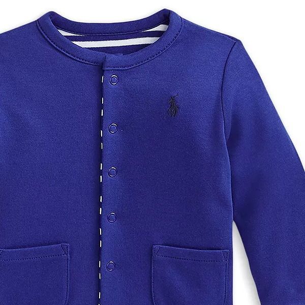 男の子用アイテム。ボーダー柄と無地の両方が楽しめるリバーシブルタイプのカーディガン。スナップボタンの前開きタイプで脱ぎ着も簡単♪