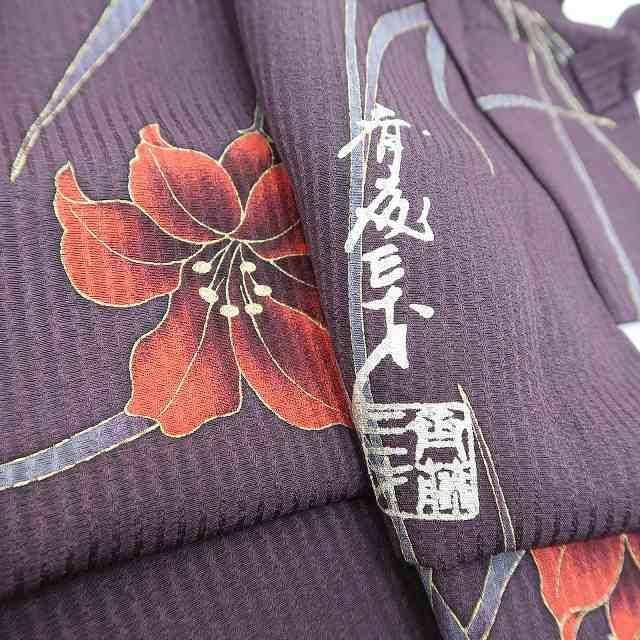 美品 斎藤三才落款 着物“秋冬にバーガンディー×縦縞×百合!”道中着 P+69