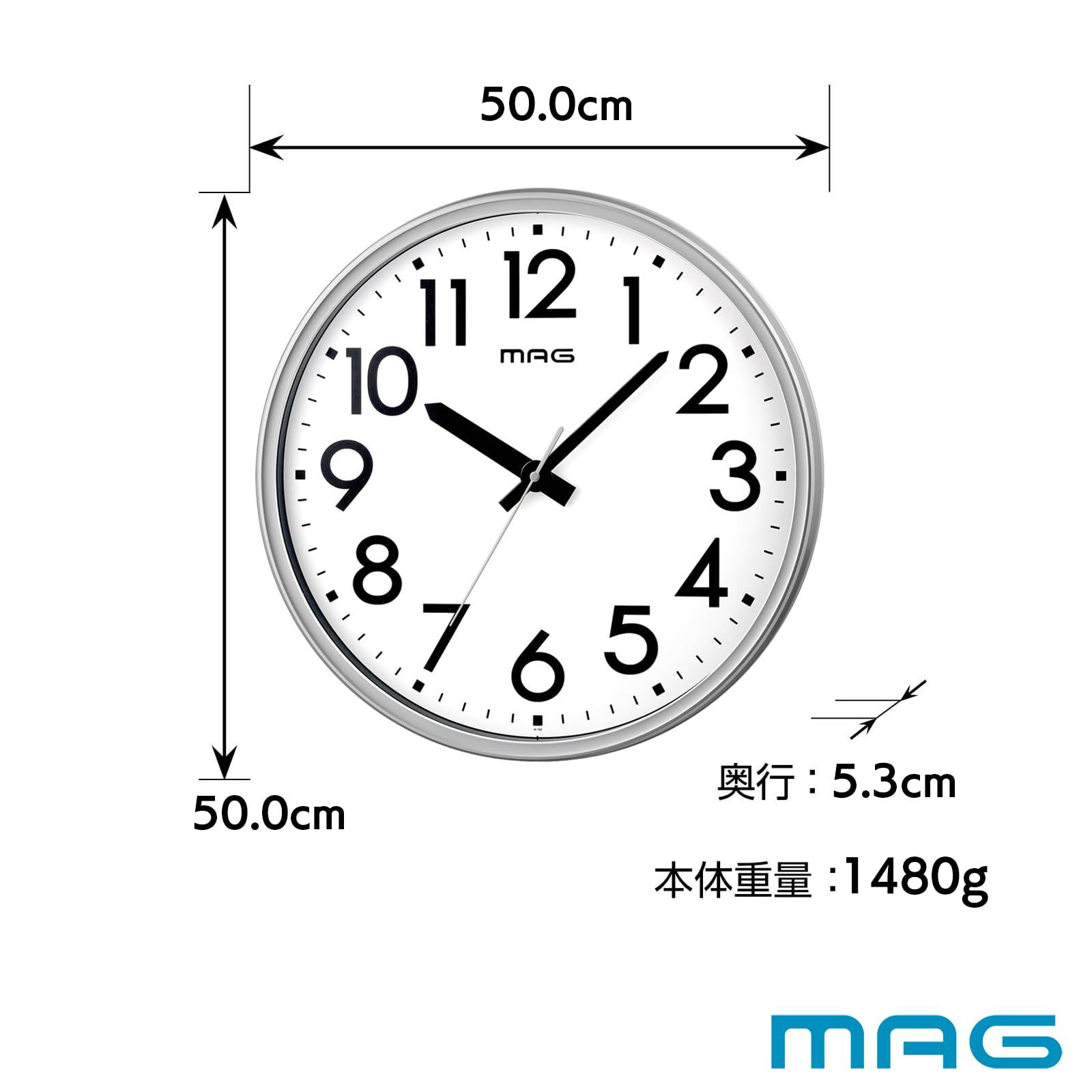 MAG(マグ) 掛け時計 壁掛け時計 オフィス 事務所 工場 倉庫 大型 大きい 直径50.0㎝ 防災 安全 プラスチック 軽量 アナログ 静音 連続秒針 電波時計じゃない シルバー メガタイム W-799A SM-Z ノア精密