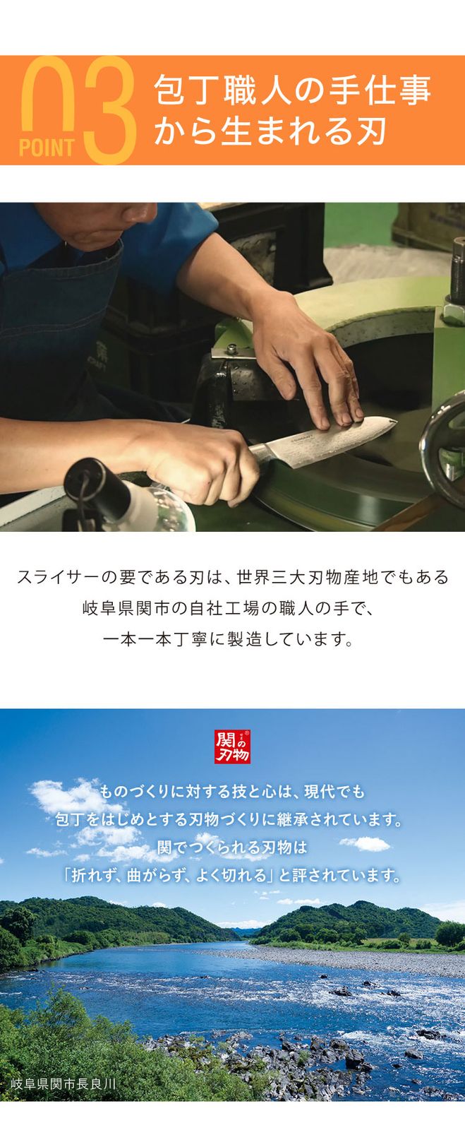 スライサーの要の刃は、世界三大刃物産地でもある岐阜県関市のサンクラフト自社工場の職人の手で、一本一本丁寧に製造しています。