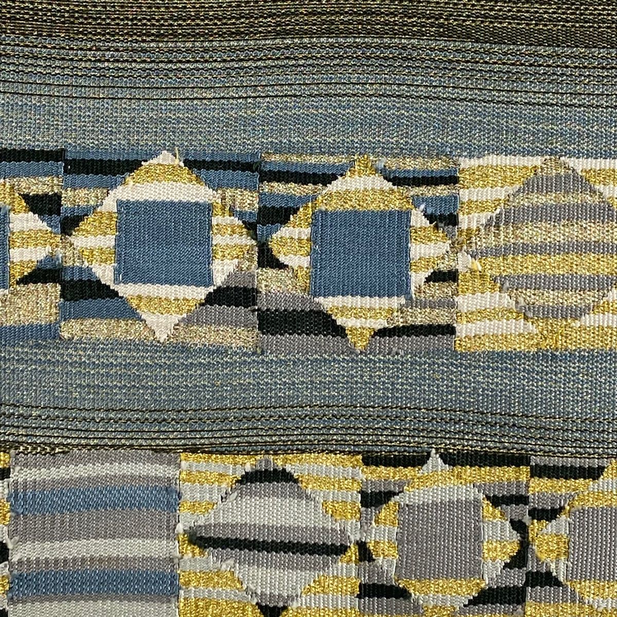 名古屋帯 秀品 八寸名古屋帯 松葉仕立て 縞 幾何学 金糸 青灰色 正絹
