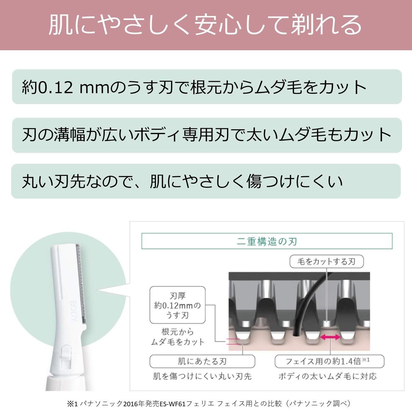 肌にやさしくしっかり剃れる、ドライ剃りタイプのボディ専用シェーバー。丸い刃先で肌にやさしい。約0.12mmのうす刃で根元からカット。ボディ専用刃でワキ、アシだけでなく、Vラインなどの太い毛もカット。肌の凹凸に合わせて動く密着スイングヘッドで肌にやさしくシェービング。電源:DC1.5V(単4形アルカリ乾電池※1×1本(別売)または単4形充電式ニッケル水素電池※1×1本(別売))付属品:掃除用ブラシ