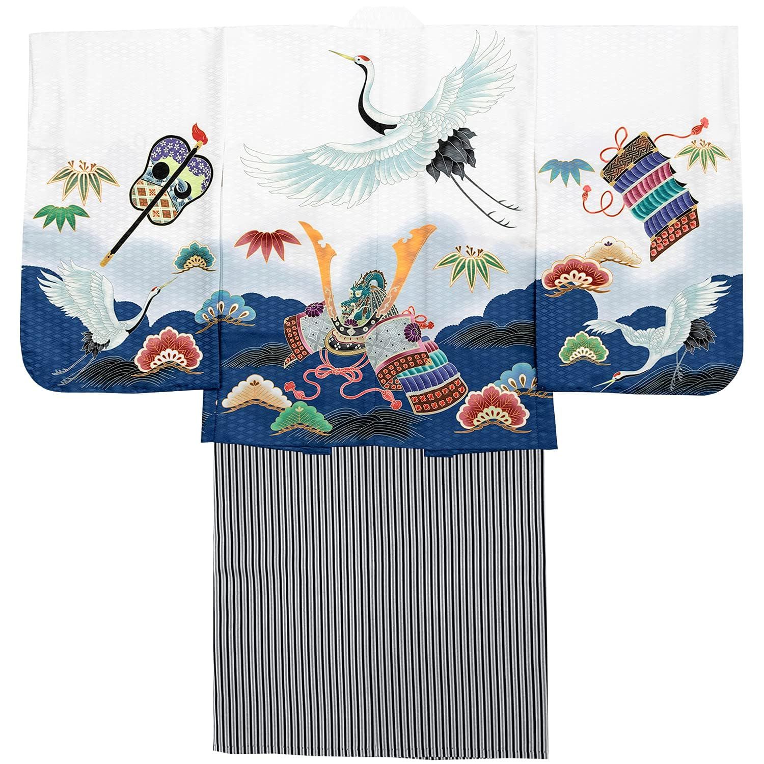 [KYOETSU] [キョウエツ] 七五三 5歳 男の子 着物 セット 羽織 袴 フルセット 753 鷹兜松 B ((13)鶴兜-白紺+黒縞, 袴 紐下60cm)