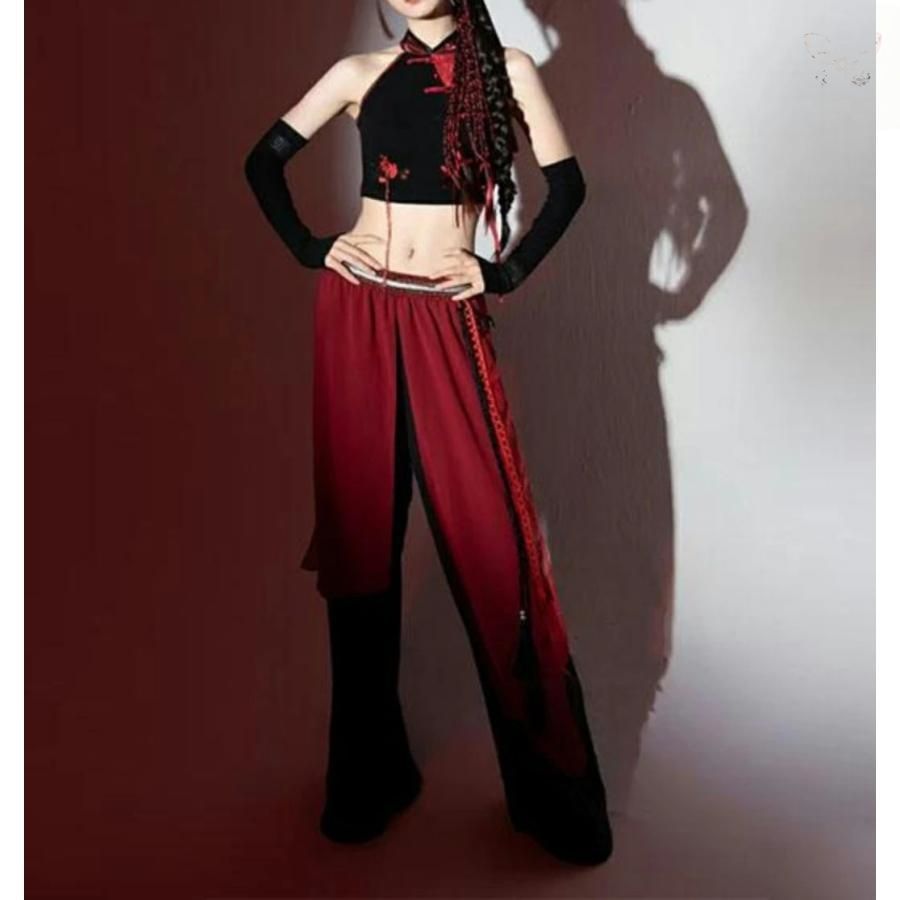 4タイプ k-pop 衣装 中華風 ダンス衣装 レディース 大人 セットアップ 黒 へそ出し ワインレッド ワイドパンツ チャイナ服 ヒップ