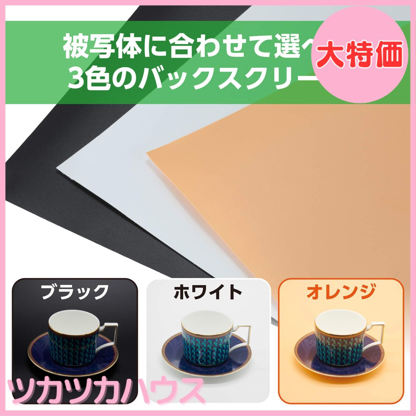 製品のカラーや撮りたいイメージで選べる3色の背景紙が付属しています。(ブラック、ホワイト、オレンジ)