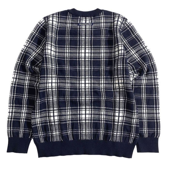 PEARLY GATES パーリーゲイツ ゴルフ 日本製 ウール混 ジャガードニット ナバホ×チェック柄 クルーネック 長袖 ニット セーター プルオーバー ゴルフウェア 053-2270113 定価3.7万 ネイビーブラック ホワイト ▲041▼51008w01