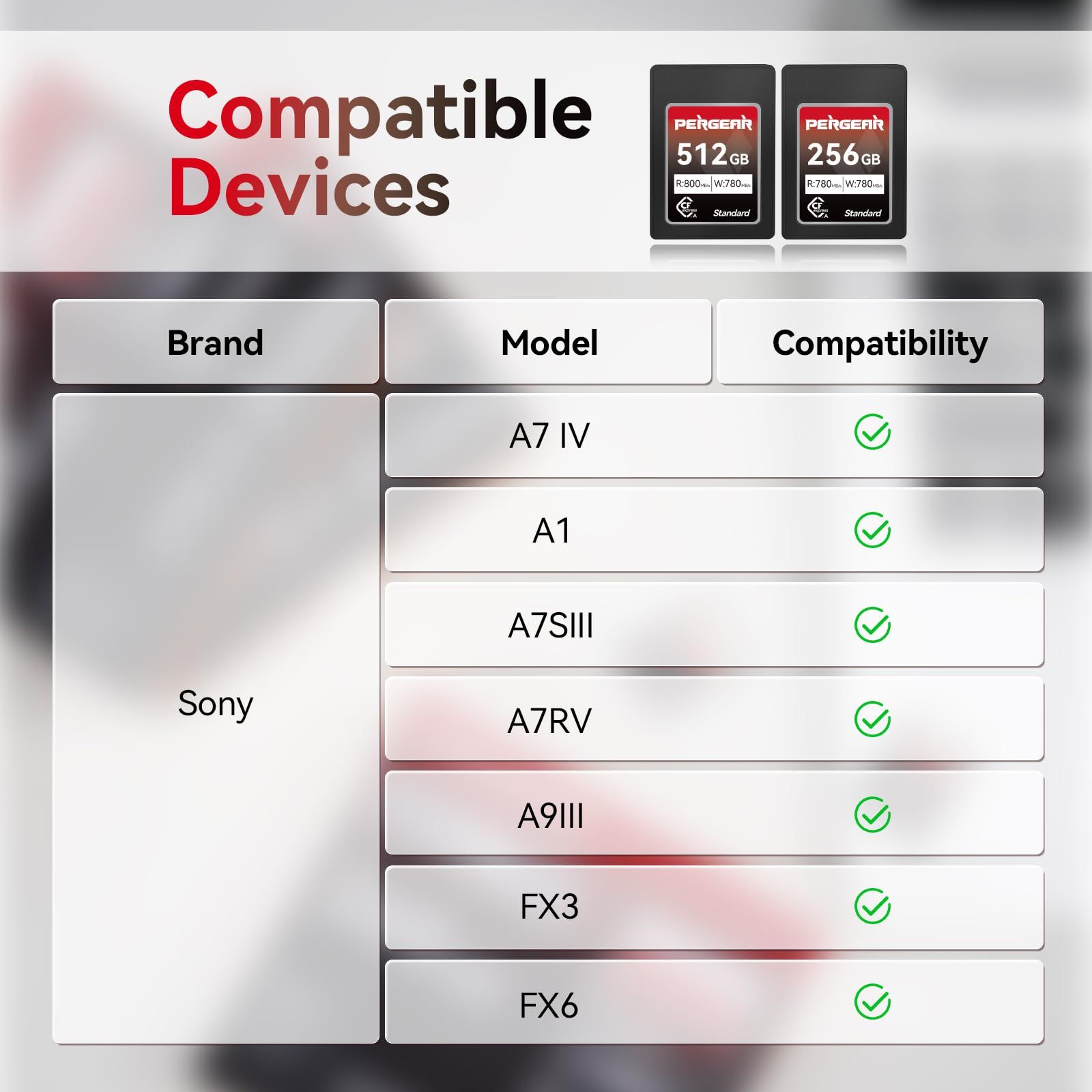 互換性について: Pergear 256GB CFexpress Type Aカードは、Sony Alpha & FX :Sony A7 IV、A1、A7SIII、A7RV、FX3、FX6、A9IIIなどと互換性があります。
