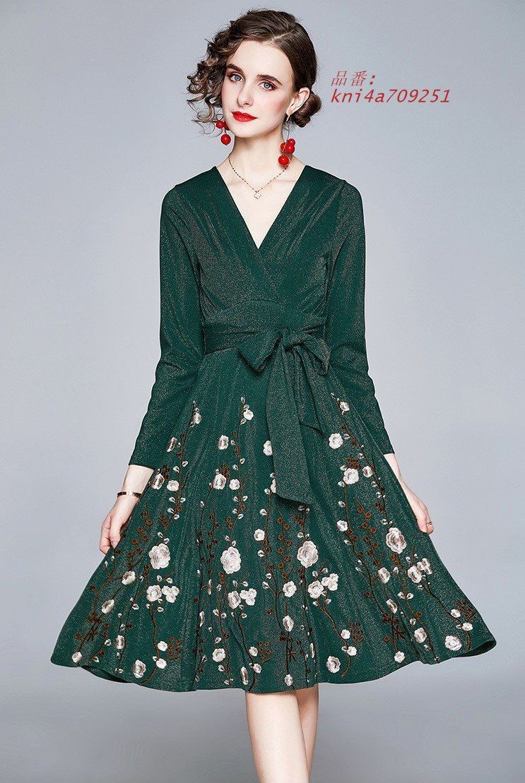 新着 ワンピース M-3 L 花柄刺しゅう 上品 Vネック 長袖 膝上丈 2次会 202111 ウエストリボン パーティ 202112 通勤 結婚式 おでかけ kni 4 a 709251