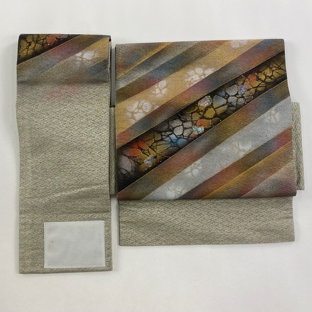 付け帯 秀品 作り帯 斜縞 幾何学模様 螺鈿 金銀彩 灰茶 正絹