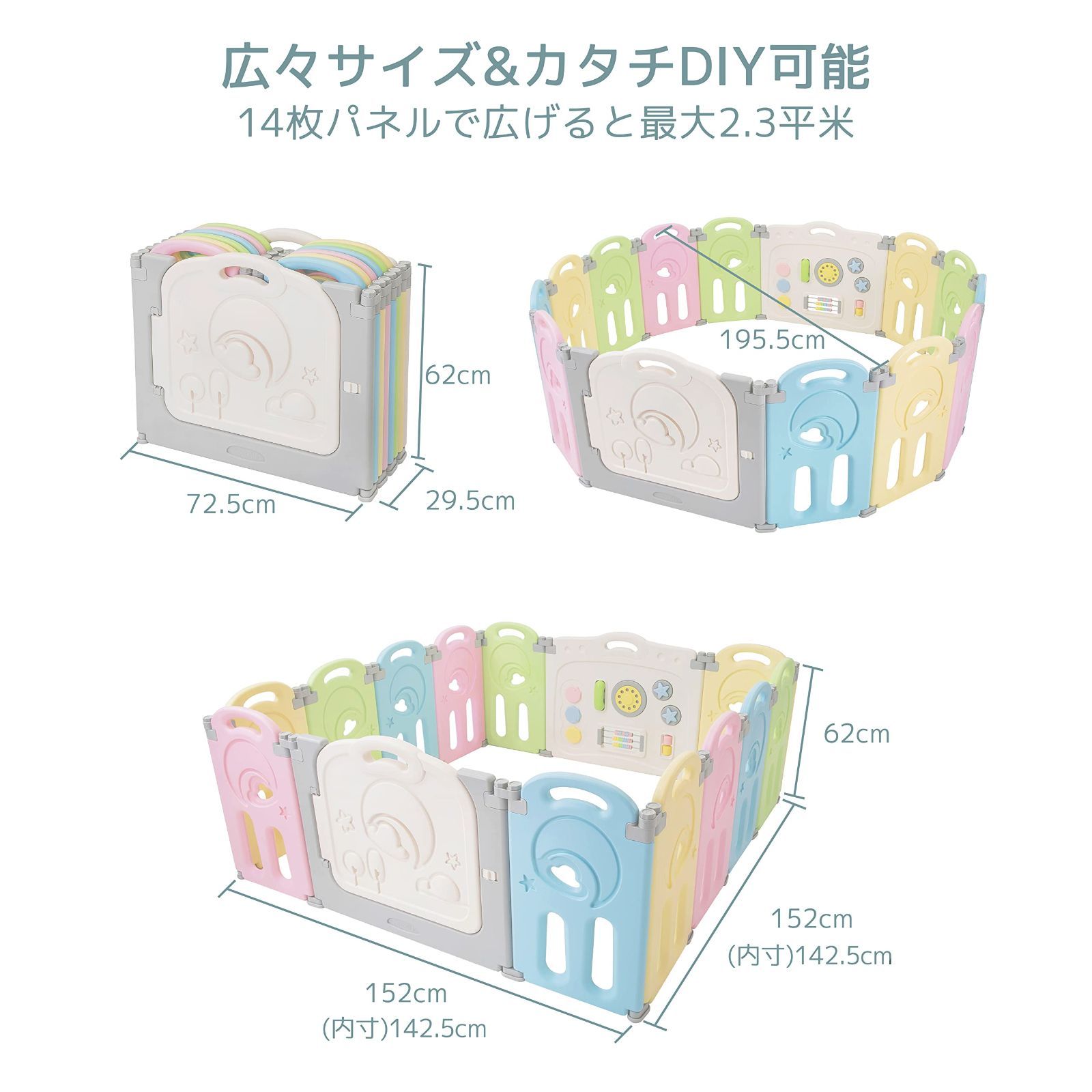 「赤ちゃんがのびのび遊べる広さ」広げると最大2.3平米・高さ62cm。
