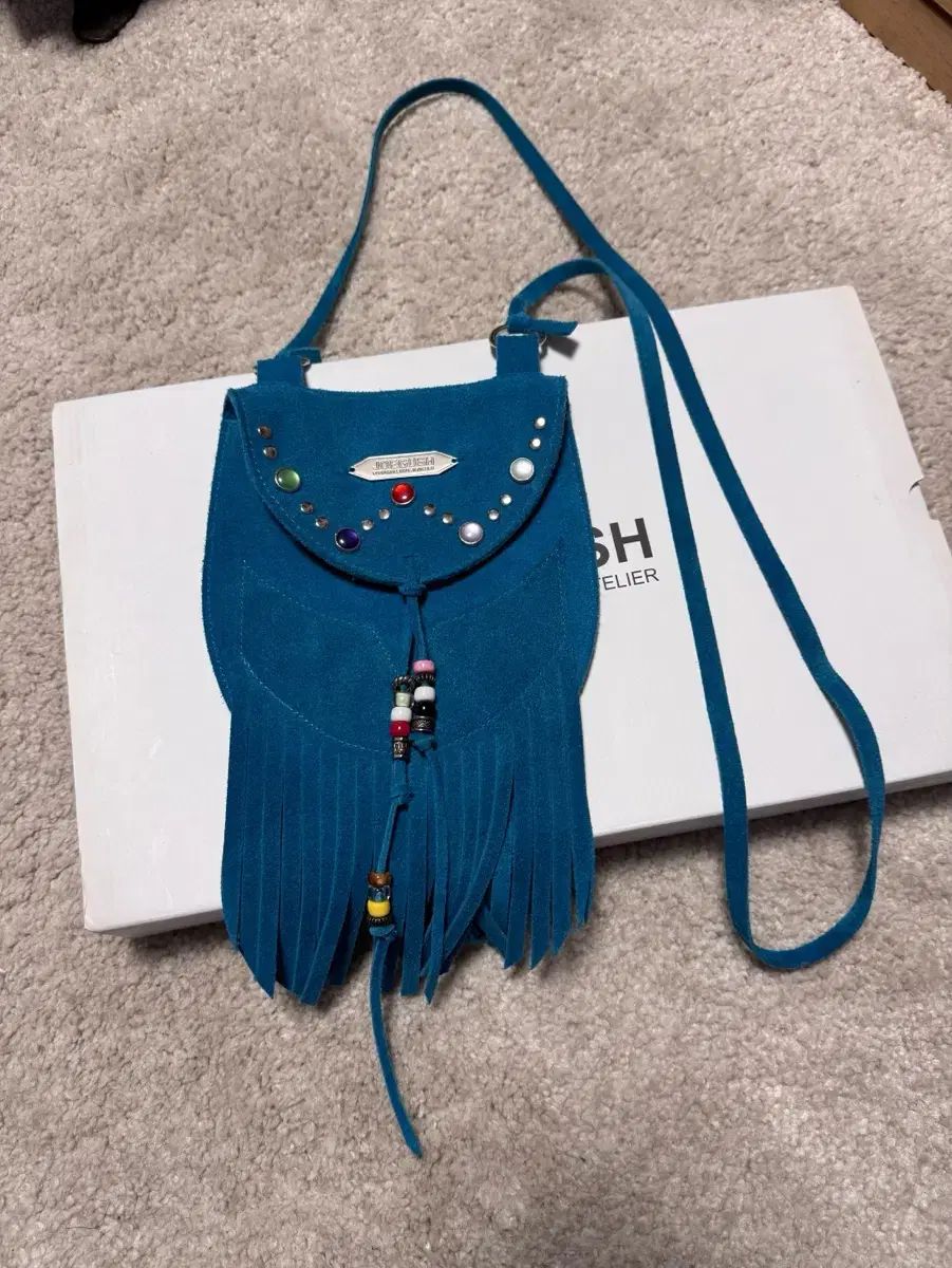 JOEGUSH ブルー スウェード 素材 ウェスタン フリンジバッグです。ユニークなフリンジデザインと、目に留まるブルーのカラーが魅力的です。別途コメント(※メルカリshop取引では対象外、Mercari窓口まで要連絡)がなければ、すぐに安全決済をお願いします!