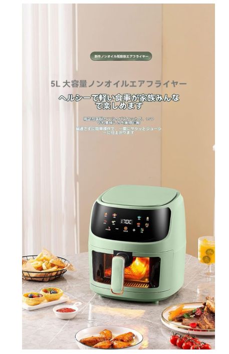 ノンフライヤー エアフライヤー 電気フライヤー ノンオイルフライヤー 8 L大容量 3 D熱風 360°空気循環 可視窓 ノンオイル 揚げ物 油無し 過熱保護 全自動 健康フライヤー LCDディスプレイ過熱保護 簡単操作家庭用 グリーン