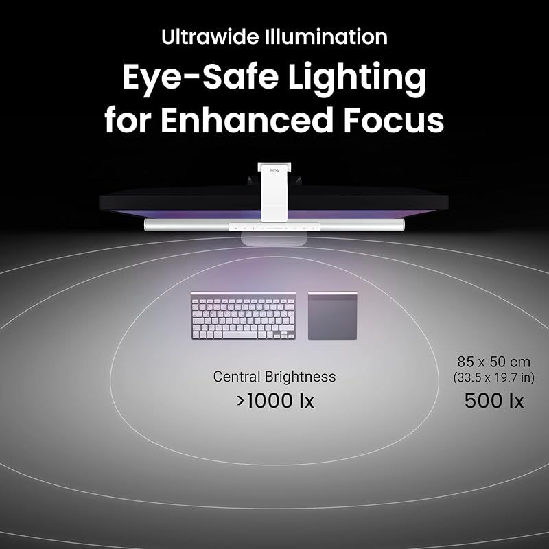 広範囲照明:ScreenBar Pro の中央照度が1000ルクス以上で、85*50cmの範囲で500ルクスの照度を提供し、ほとんどのPC作業環境において目に優しい快適な照明を提供します。