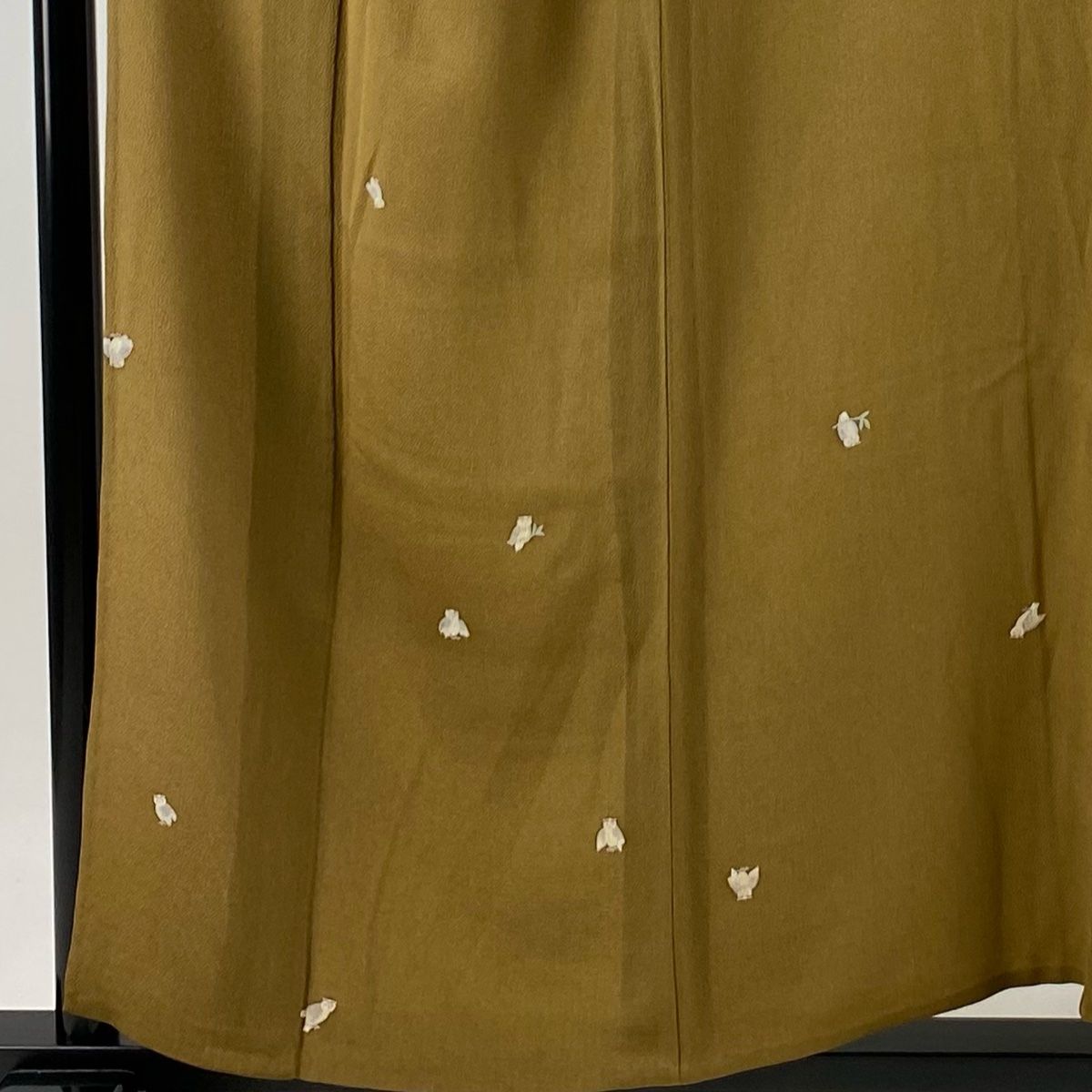 小紋 身丈155.5 cm 裄丈65 M 単衣 落款 フクロウ 縮緬 山吹茶色 正絹 秀品