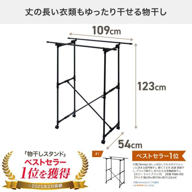 天馬 Tenma 出しっぱなしでもスタイリッシュに決まる室内物干し 軽くて丈夫 洗濯 部屋干し ブラック物干し 折りたたみ 物干し マットブラック 型番 PSBK 09 サイズ 幅109 奥行54 高さ123 cm