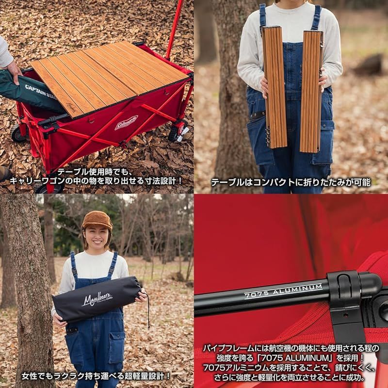 【超軽量の1.96】天板・パイプフレーム全てにアルミニウム合金を使用。実用性の高い軽量ボディを実現。 【汎用タイプ】独自に自社開発したパーツ設計により、一般的なアウトドアキャリーワゴンに対応!