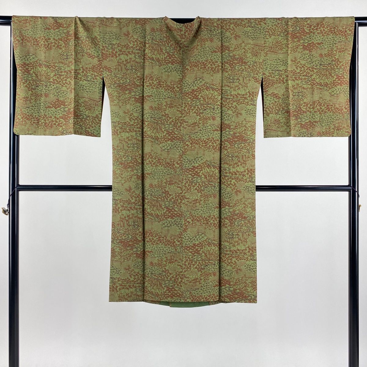 道行 身丈111 cm 裄丈68.5 L 和装コート 角衿 流水 草花 よもぎ色 正絹