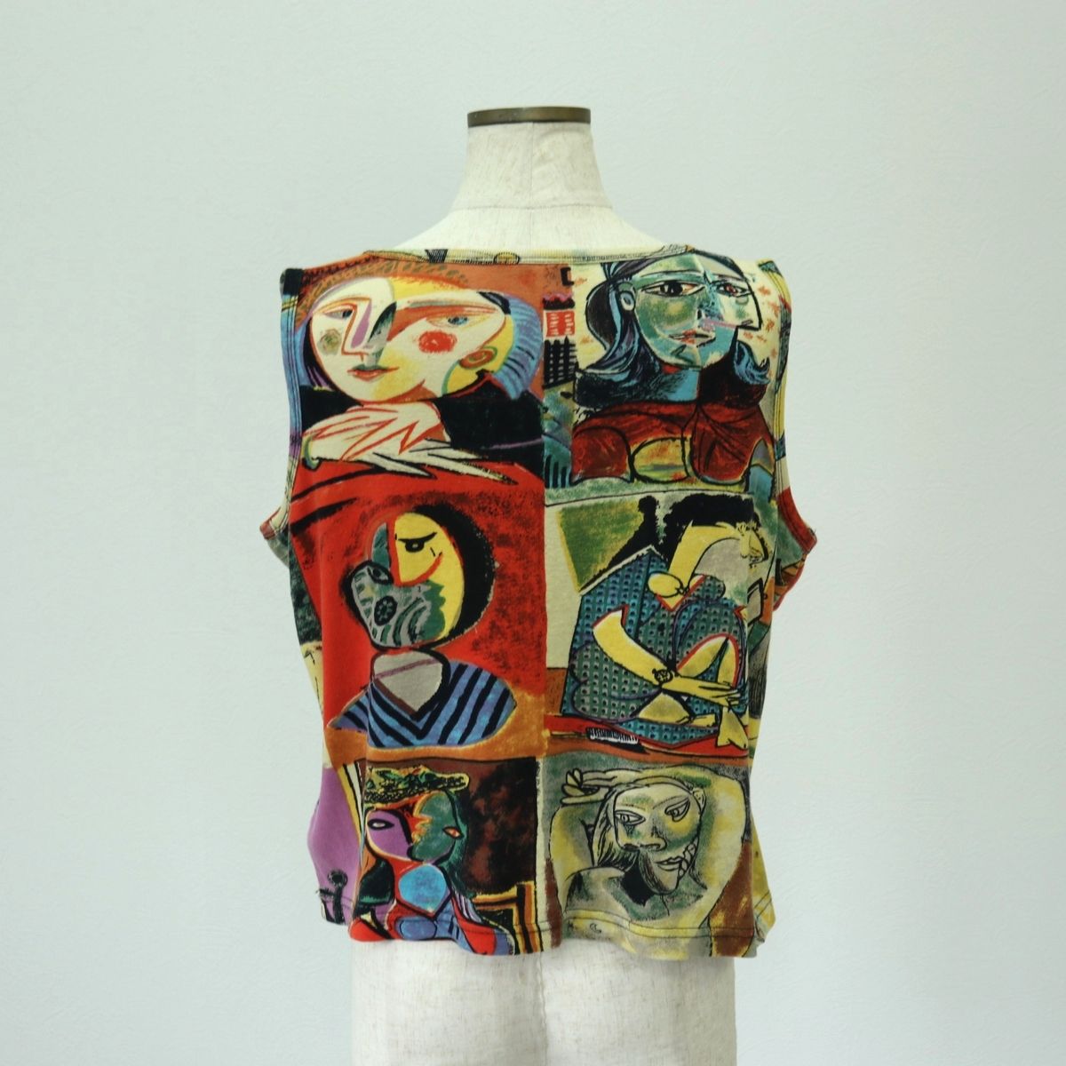 古着 PICASSO ピカソ Vネック オールオーバープリント ビーズ付き タンクトップ レディースM相当|eaa 550621
