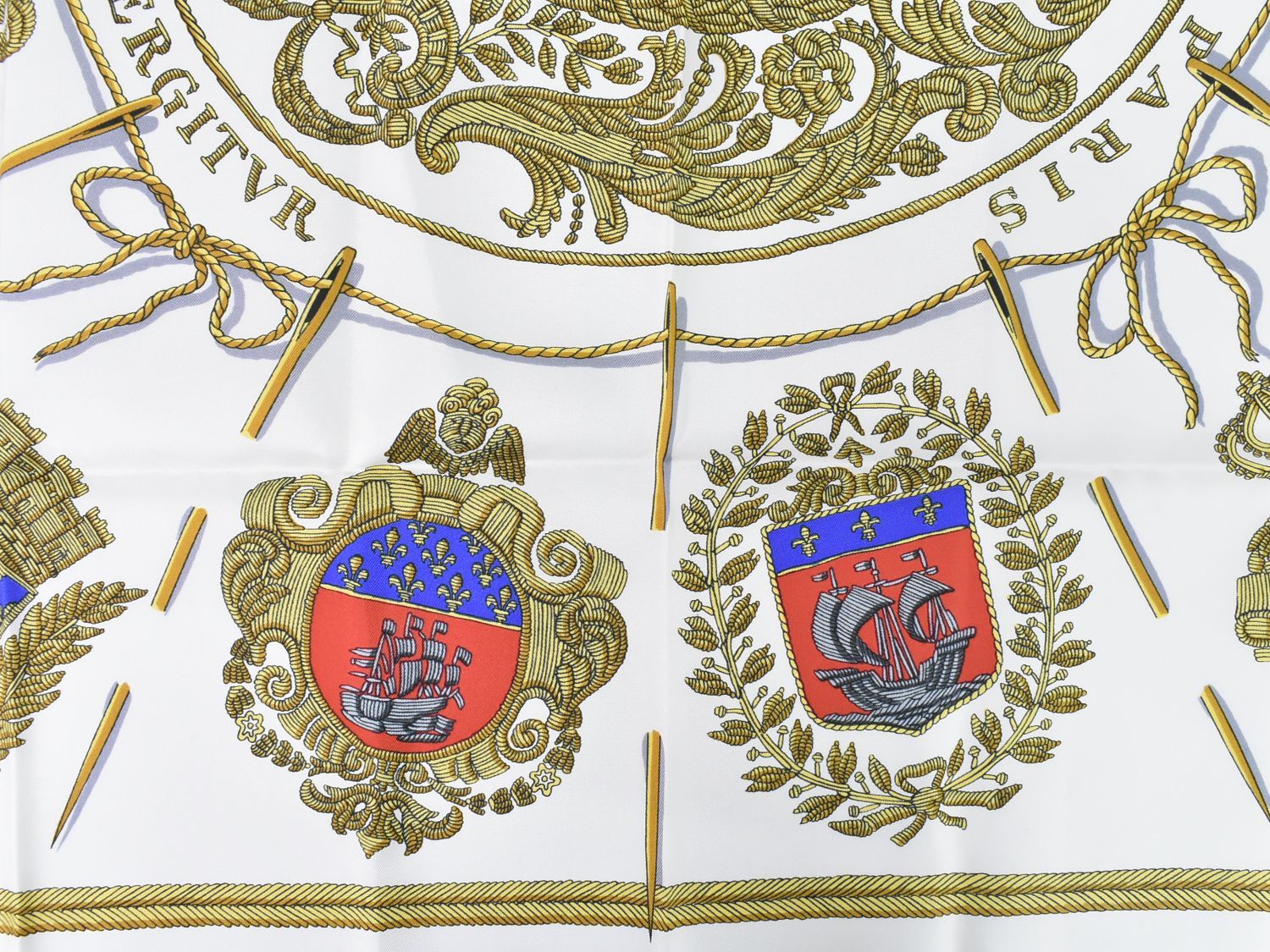 エルメス HERMES スカーフカレ カレ90 FLVCTVAT NEC MERGITVR パリの紋章 スカーフ ショール シルク ホワイト イエロー 服飾小物 フォロー割