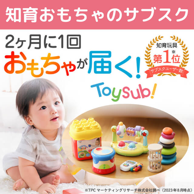 トイサブ!は、0歳3か月〜満6歳の未就学児のお子様一人ひとりの成長に合わせた知育おもちゃが届く、今子育て世代に大人気のおもちゃサブスクリプションサービスです。