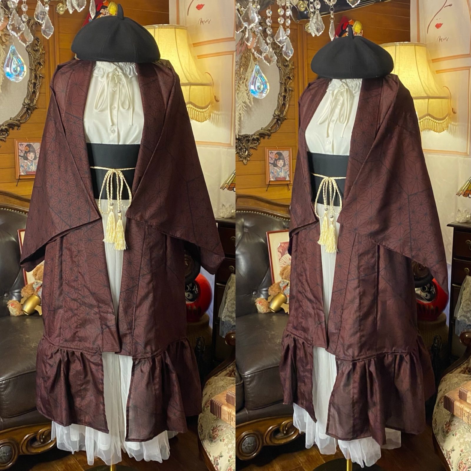 【夏着物 2way ガウン 羽織り ドレス ワンピース ハンドメイド 和洋折衷 洗える 化繊 リメイク 帯サッシュベルト レトロ 新品 深い煉瓦色の地に、墨色で描いた大小の麻の葉がふわりと連なる幾何。 深い煉瓦色の地に、墨色で描いた大小の麻の葉がふわりと連なる幾何。 KD-59 】