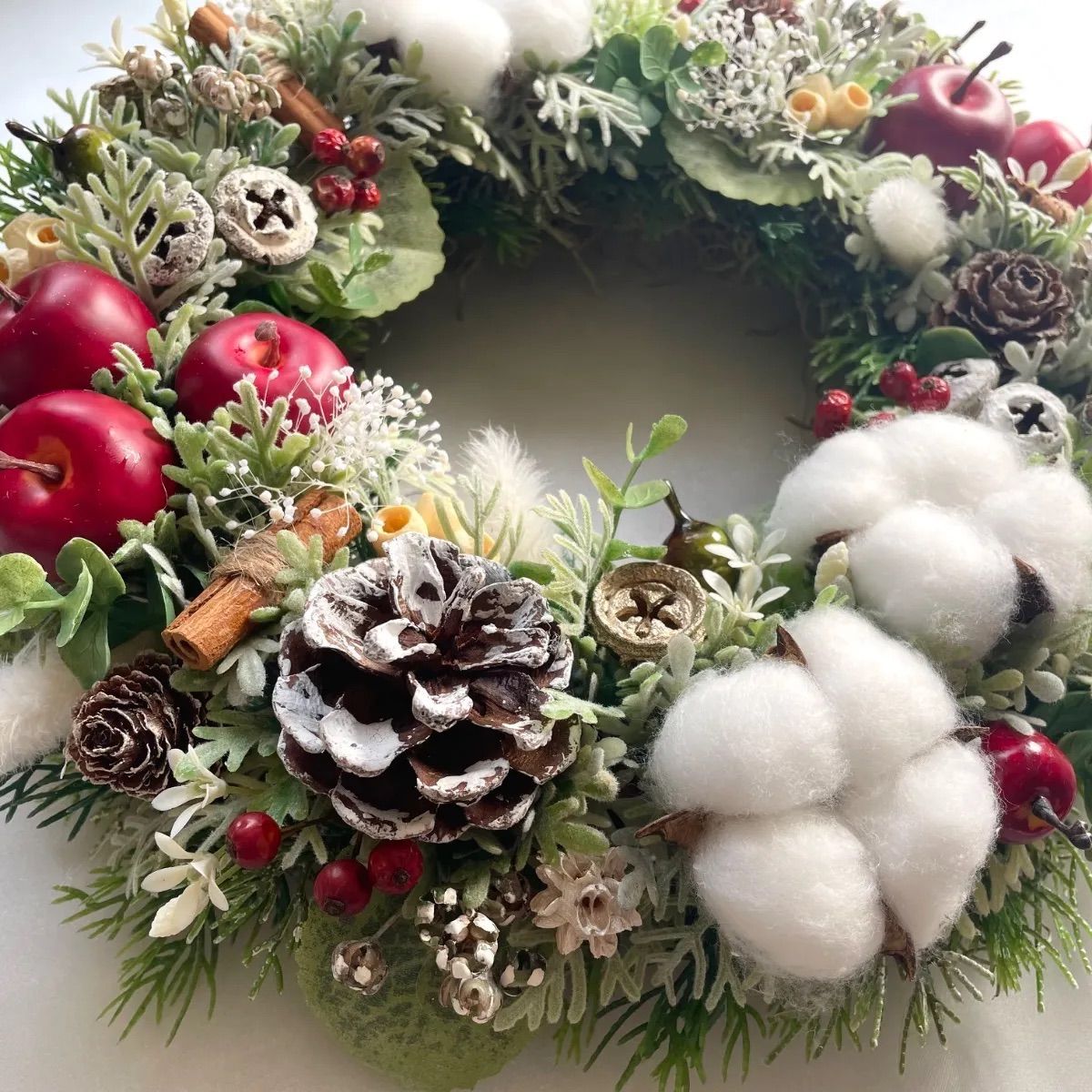 雪をまとったようなホワイトグリーンを基調にレッド・ホワイト・グリーン・ゴールドとクリスマスの定番カラーで彩りを加えた大きめの大人可愛いクリスマスリースです。