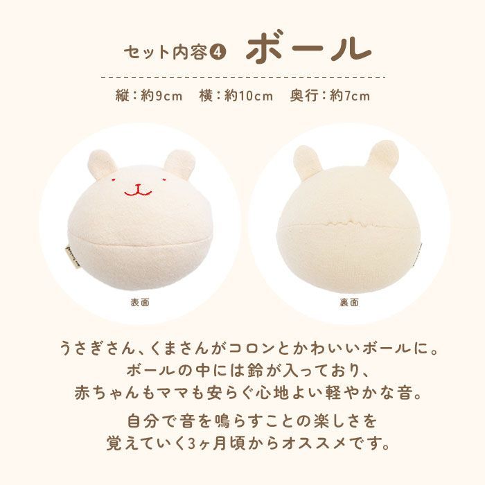 ボールは振るとカラカラと鈴の音が鳴り赤ちゃんはとってもご機嫌、ママも心安らぐ軽やかな音色。