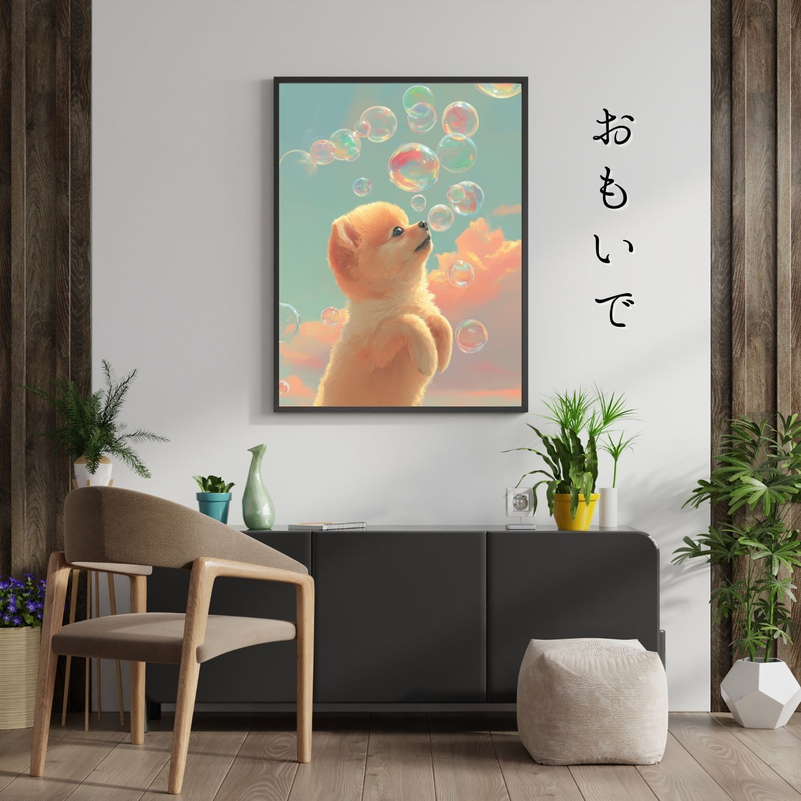 かわいいポメプー犬が、空に舞うシャボン玉を見つめる愛らしい瞬間を切り取ったアートポスターです。