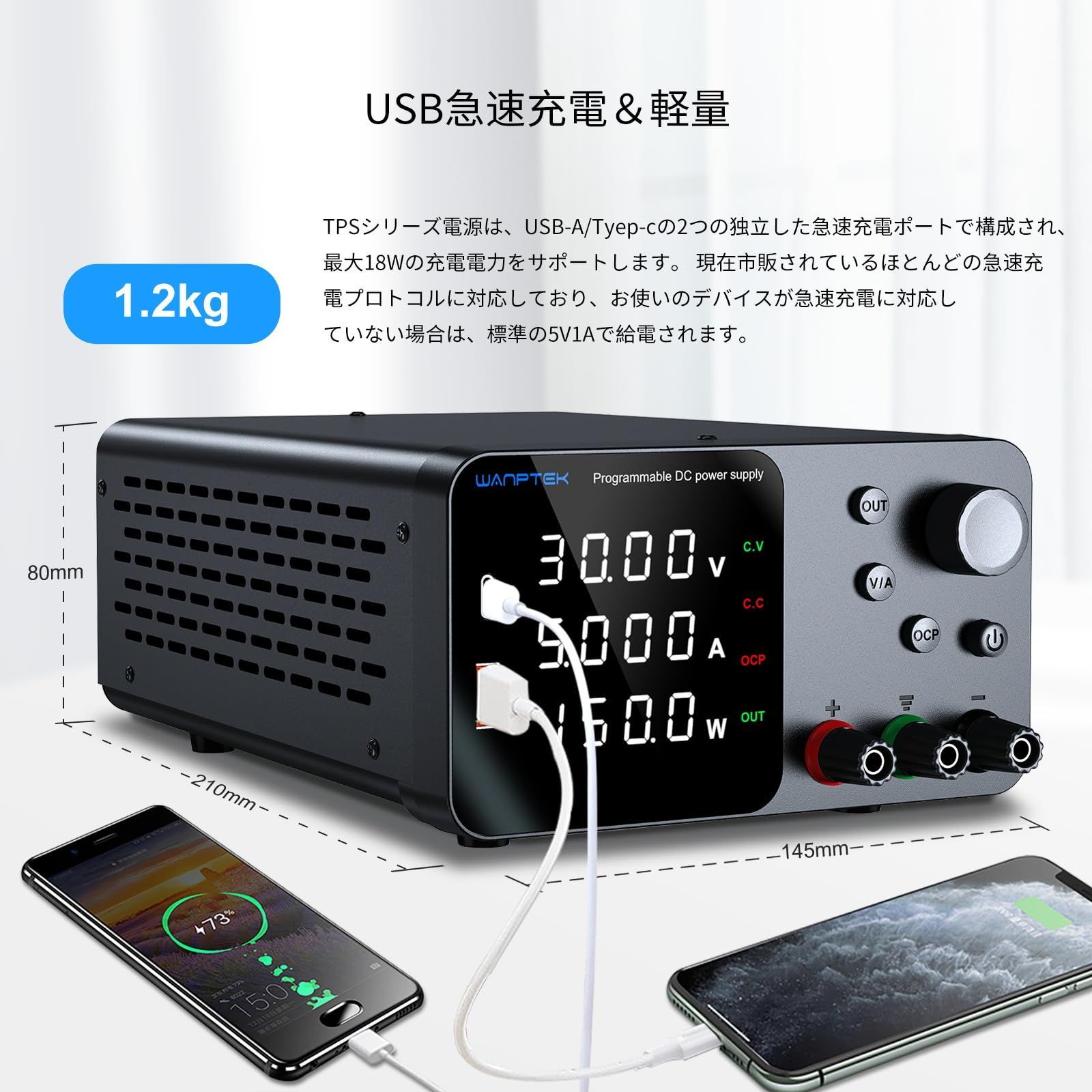 直流安定化電源30V 5A USB-A/Type-c急速充電インターフェース付き可変電源 高精度4桁LEDディスプレイ付き小型スイッチング電源 エンコーダ制御/出力ボタン、研究室、電子DIY用