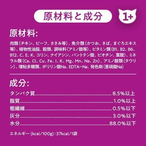 肉類(チキン、ビーフ、ささみ等)、魚介類(かつお、さば、まぐろエキス等)、植物性油脂、穀類、調味料(アミノ酸等)、ビタミン類(B1、B2、B6、B12、C、E、K、コリン、ナイアシン、パントテン酸、ビオチン、葉酸)、ミネラル類(Ca、Cl、Cu、Fe、I、K、Mg、Mn、Na、Zn)、アミノ酸類(タウリン)、増粘多糖類、ポリリン酸Na、EDTA-Na、発色剤(亜硝酸Na)