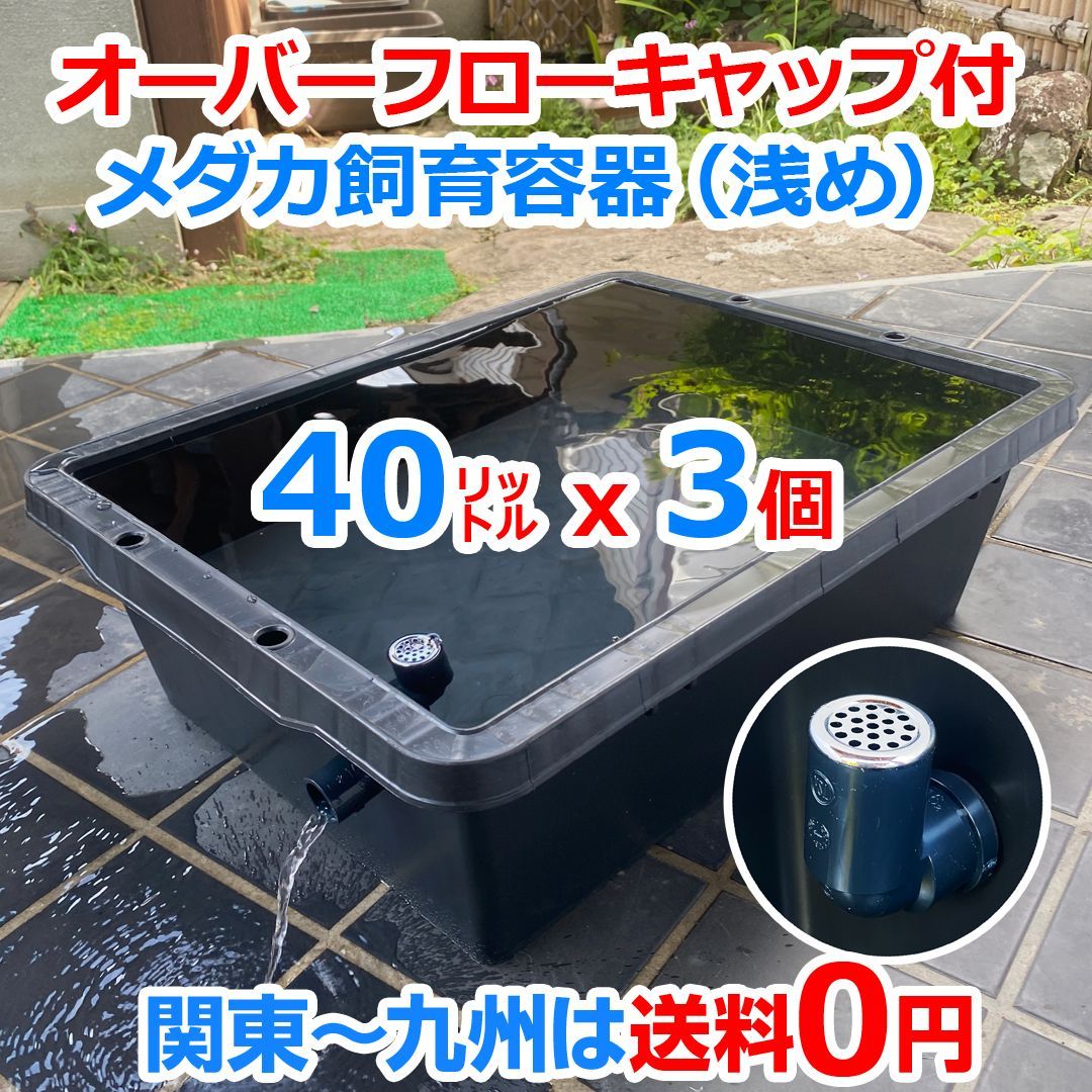 新タイプ メダカ飼育ケース 40㍑黒x オーバーフローキャップ付 浅型 トロ舟 金魚飼育容器 らんちゅう 亀 睡蓮 水草 ビオトープ メダカ水槽 大雨対策 タライ プラ舟 プラケース ボックス 金魚鉢 五色アクア