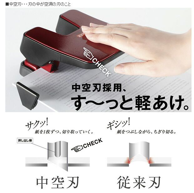 ○軽さの秘密は中空刃:刃の中の空洞に紙を取り込みながら1枚ずつ切るため、軽い力で穴あけが可能。