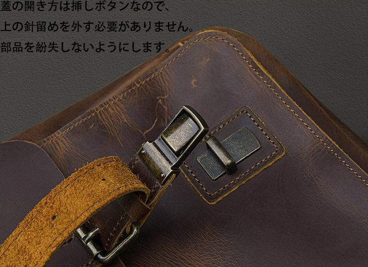 こちらのバッグは、上質なフルグレインのフォースレザー(牛革)を使用し、ヴィンテージ感漂うブラウンカラーが独特な風合いを演出しています。ダブルレザーベルトのデザインで、見た目の美しさだけでなく、小物の収納にも便利。大容量のメインコンパートメントには、33cm × 23cm のノートパソコンなども余裕で収納可能です。