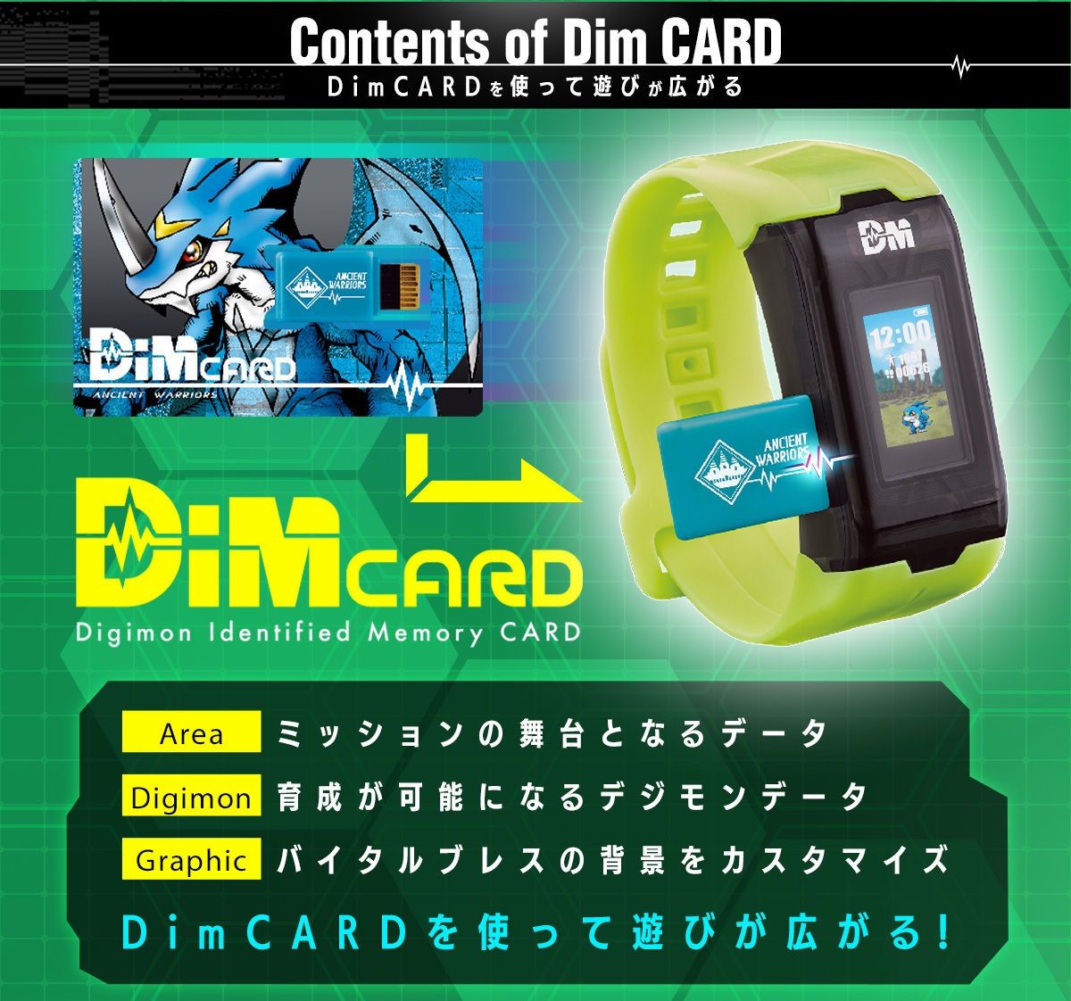 別売りの連動アイテム『Dimカード』を使用することで、新たなエリアを解放したり、育成できるデジモンを増やしたりすることができます。