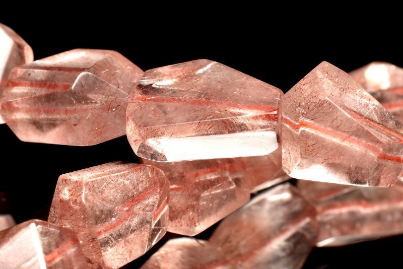赤く美しい物はファイアークォーツ、その他にもハーレクインクォーツ、ハーレクイン水晶など流通名を多数持った天然石です。