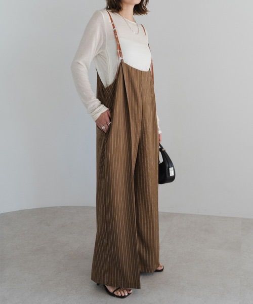 フェイクレザーの華奢なサスペンダーが、モードな雰囲気を引き立てます。