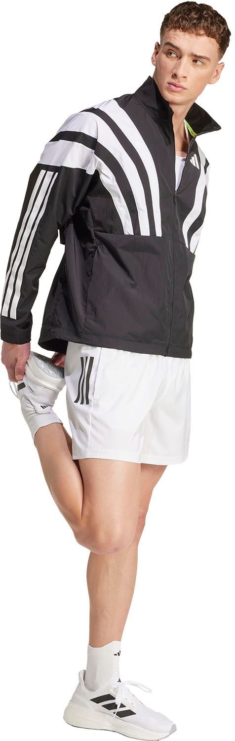 ADIDAS の ADIZERO ランニングジャケットで、過去のスピリットを感じながら、今この瞬間を駆け抜けよう。脇の下に通気孔パネルを備えた軽量リップストップファブリックは、ウォームアップやクールダウンなど、さまざまな場面で活躍。薄暗い場所での視認性を高めるリフレクターディテールと、湿気の多い環境にも耐える耐久性に優れた撥水処理を採用している。