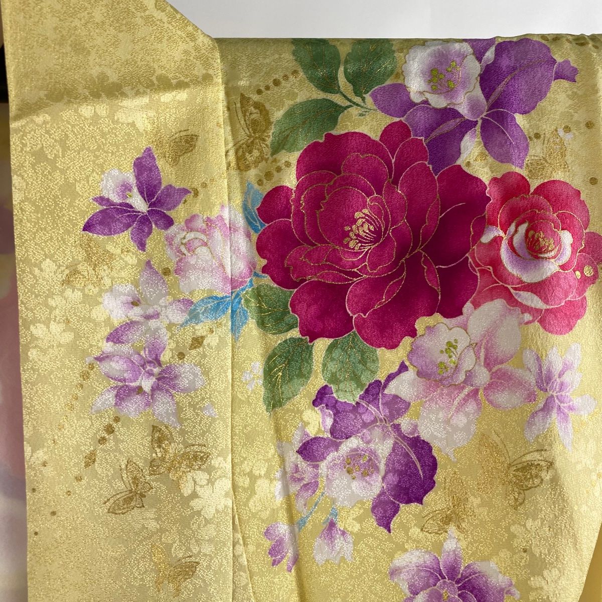 振袖 身丈166.5 cm 裄丈66 M 袷 袋帯フルセット 薔薇 蝶 箔 金彩 薄黄 正絹 秀品