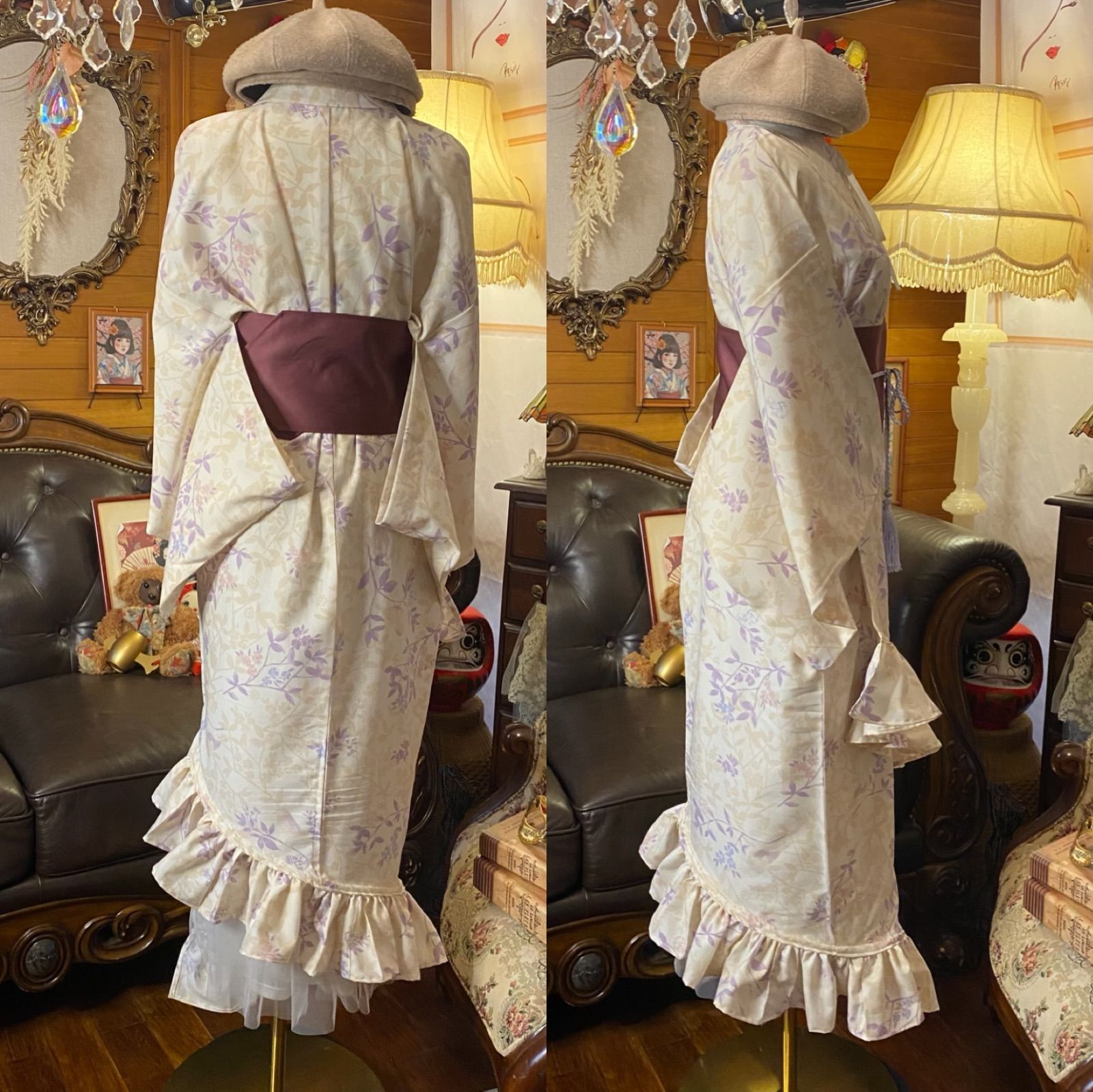 単衣着物 2 way アシンメトリー ガウン 羽織り ドレス ワンピース ハンドメイド 和洋折衷 洗える 化繊 リメイク 帯サッシュベルト レトロ 古着 藤色やくすみピンクの花々と葉っぱ KD-76