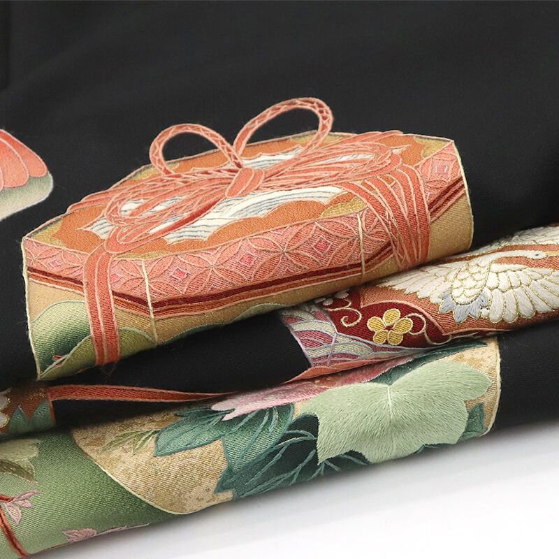 黒留袖 袷着物(新品・貸衣装処分品) 刺繍で表現された貝桶、鶴、蛤などが豪華な黒留袖。 蛤の貝殻は、左右がぴったり重なって初めて合います。 他の貝殻とは絶対に合わないため、 古来より「夫婦和合」「相思相愛」「円満」の象徴とされ、 結婚式の際には、縁起の良い柄として重宝されております。 刺繍で表現されたお祝い柄は、 豪華さ・気品を兼ねそろえた逸品です。