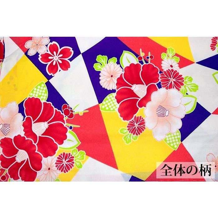 白・青・ピンク・黄色のモザイク模様に、薄ピンク色・赤色・黄緑色の桜・菊・梅・牡丹柄です。