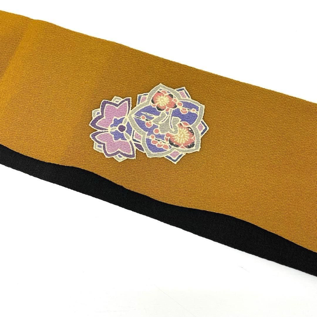 深みのある黄土色地に、華やかな花文様が染められた名古屋帯です。