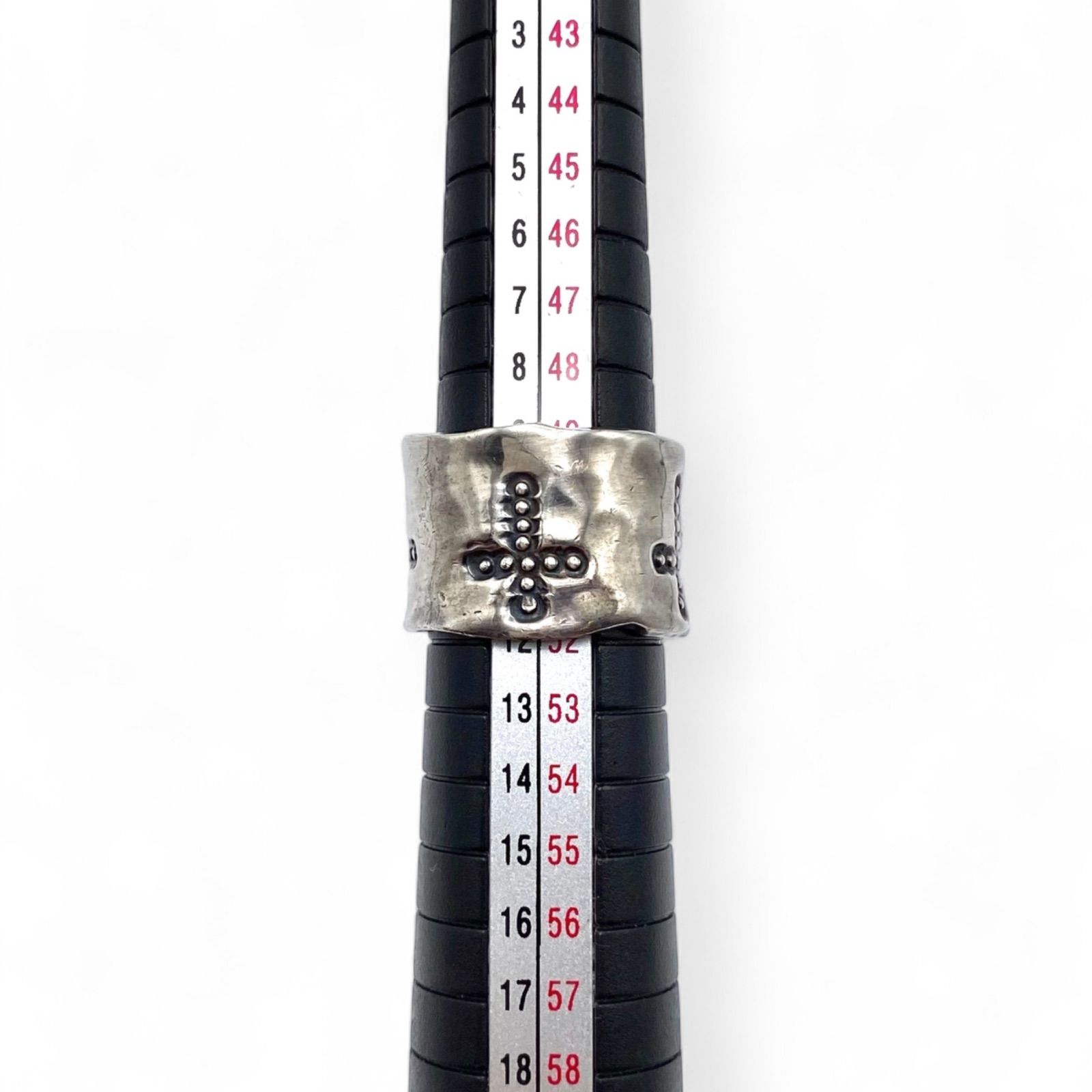 メキシコ製ならではの厚みと重みを感じるシルバー925リング。中央にはクロスモチーフが深く刻まれ、力強さの中に祈りのような静けさを漂わせます。荒々しい質感が手仕事の温もりを伝え、ヴィンテージシルバー特有の存在感を放つ一点です。