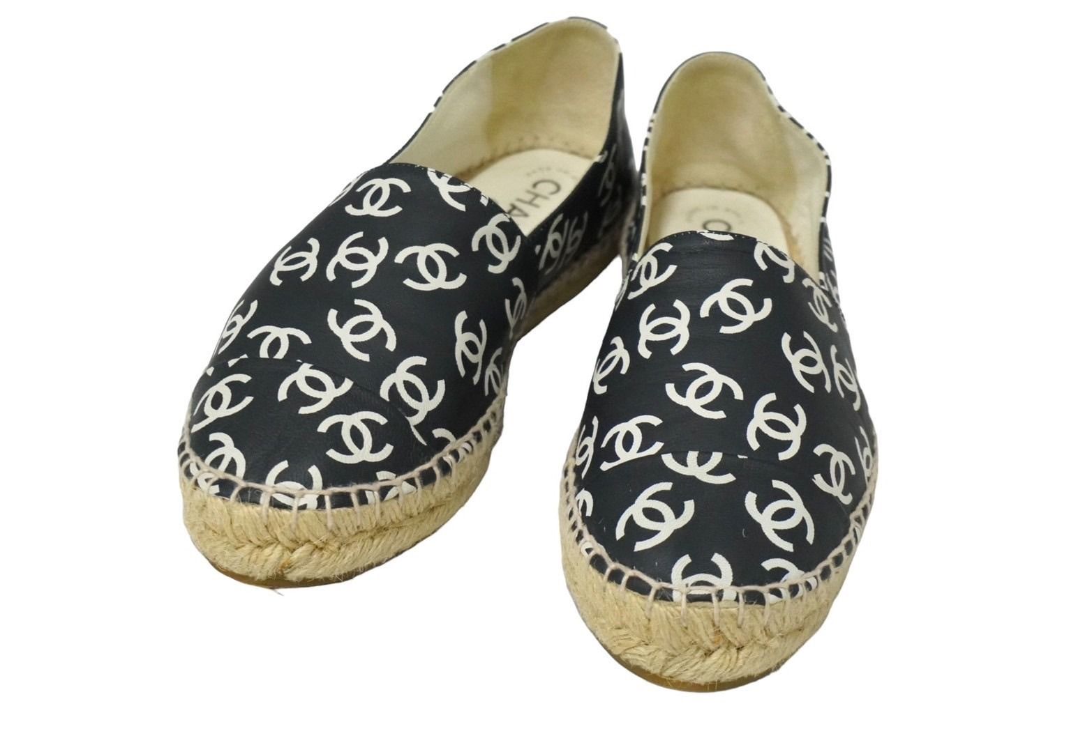 【説明】シャネルのエスパドリーユです。シャネルのこちらのモデルでは総柄ココマークは珍しいデザインです。