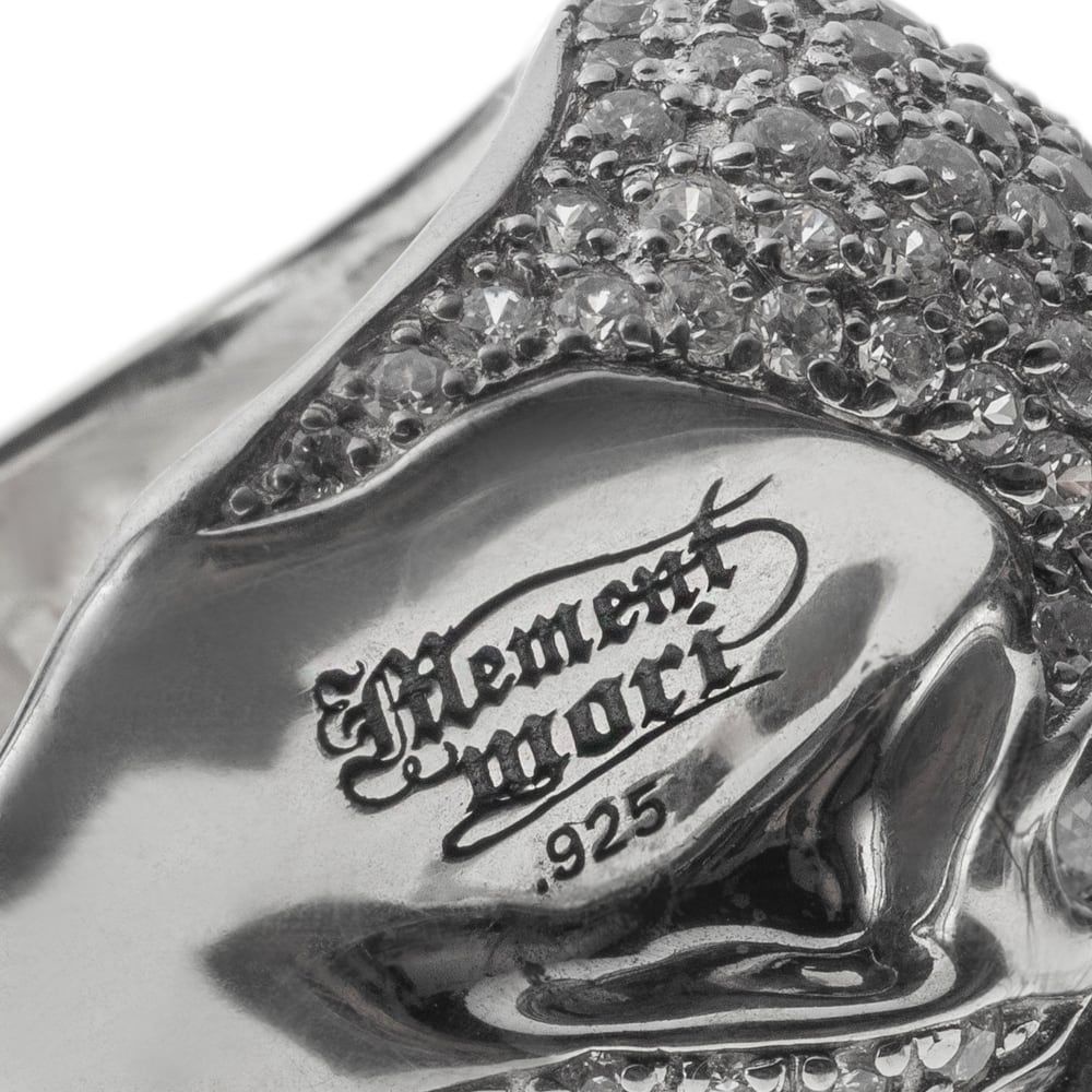Commanding and unapologetic, this voluminous skull ring is engineered to catch the light—and hold the gaze. Two bold, deep-set CZs blaze from the eyes, while the forehead is paved with precision-set clear stones that shimmer in a refined, even glow. “Memento Mori” is engraved at the right temple—a reminder to live fully in the now—balanced by the brand logo and hallmark at the left.