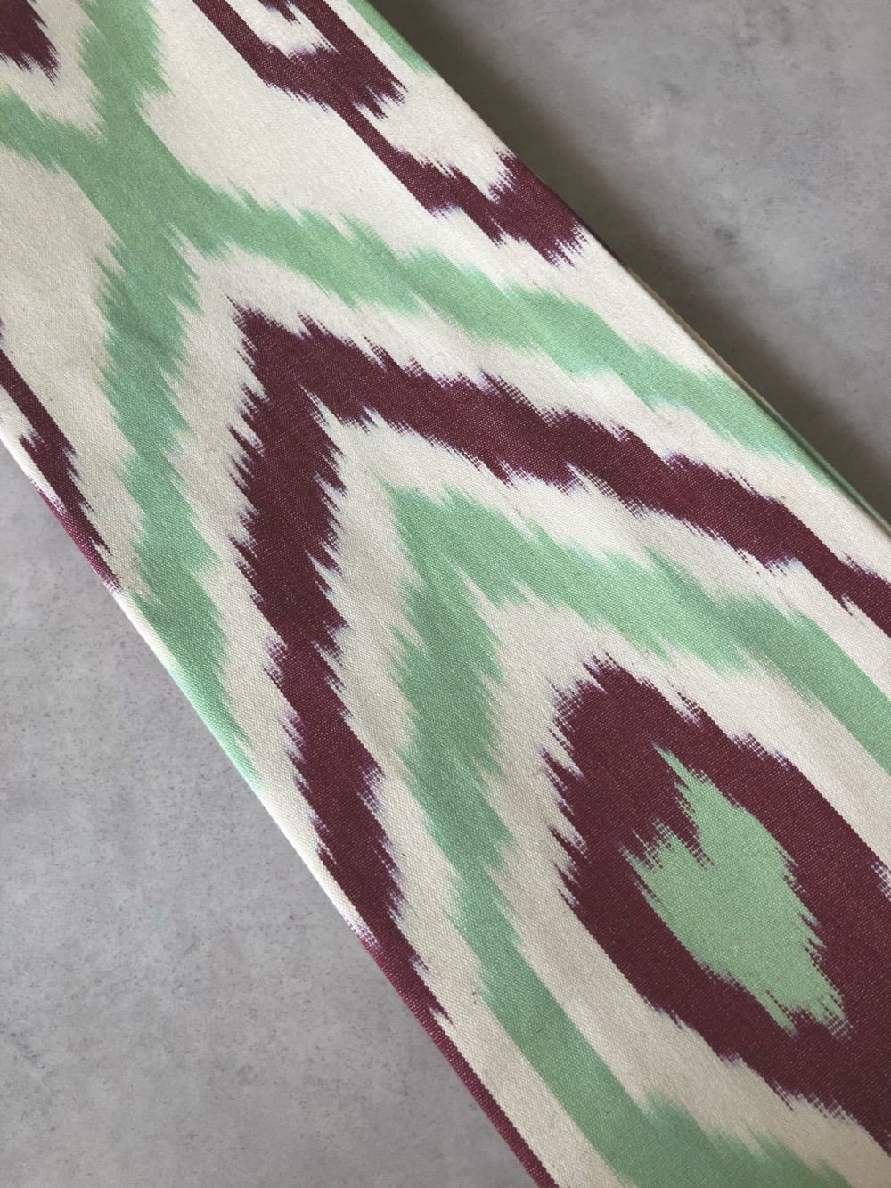目を引く大きめのイカット模様は、ミントグリーンとバーガンディの落ち着いた配色が特徴。