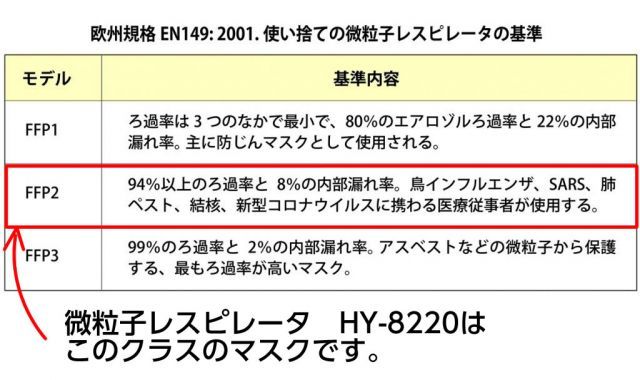 微粒子レスピレータ『PM-HY8220』は、ヨーロッパEN規格のFFP2クラスのレスピレータで、最近、よく名前を目にする米国規格のN95マスクや日本検定規格の防塵マスクDS2等を大きく上回る性能を有するものです。もともとウィルスよりさらに細かい粉塵対策として開発されたもので、ダスト(粉塵)マスクとも呼ばれています。