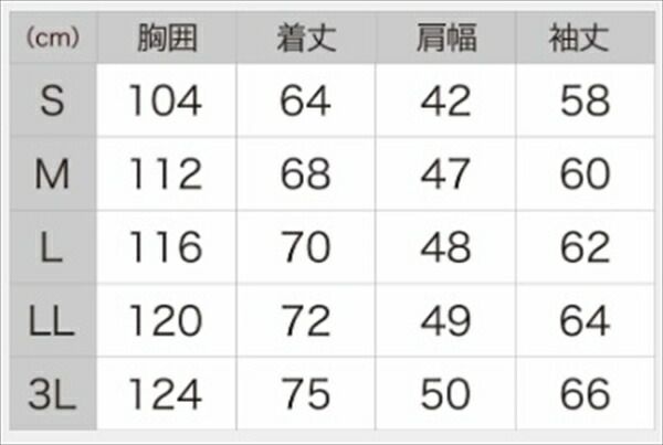 寸法:胸囲112、着丈68、肩幅47、袖丈60cm