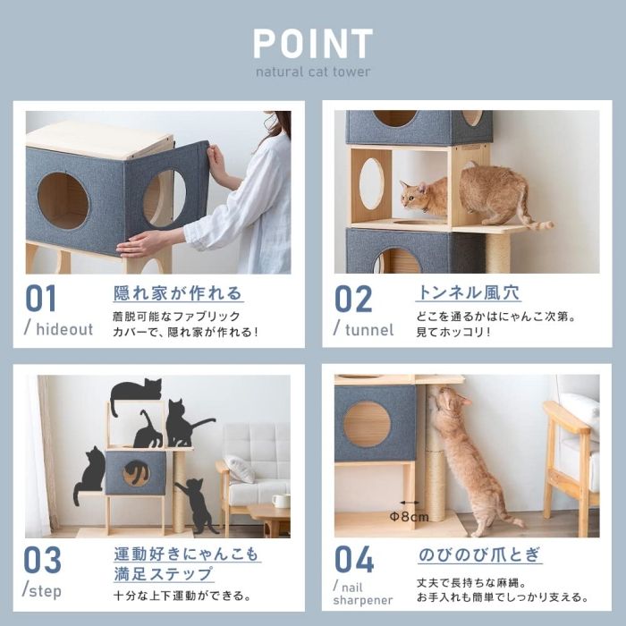 天然木を使用し、ナチュラルなインテリアにも馴染むシンプルなデザインの3段のキャットタワーです。ステップやネコが通れる穴付きで元気にお家で遊べます。隠れ家にもなる着脱可能なファブリックカバー付きです。ネコが立ってのびのびと爪とぎができる爪とぎポール付きです。お客様組み立てとなります。 耐荷重(約):棚板1枚あたり6kg