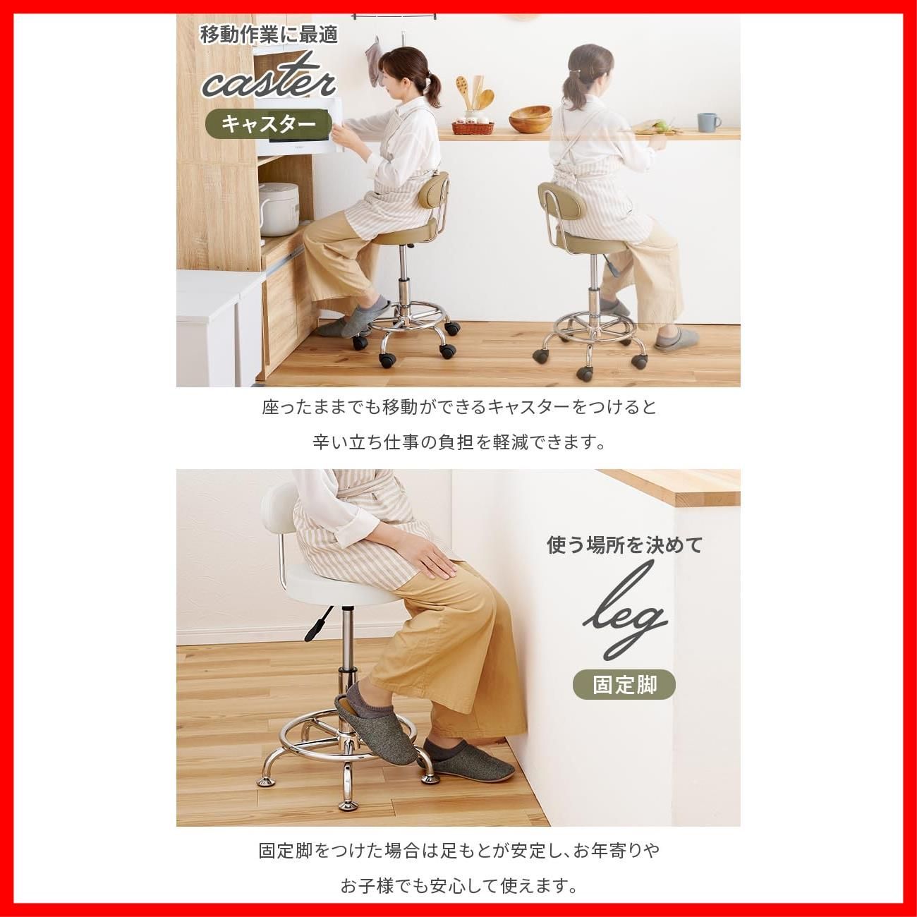 台所仕事が疲れる方以外にも、デスクチェアや、カウンターチェアとしての使用にも最適です。